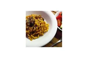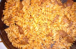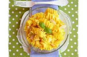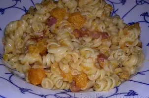 Fusilli con calabaza moscada, tocino ahumado y salsa de queso